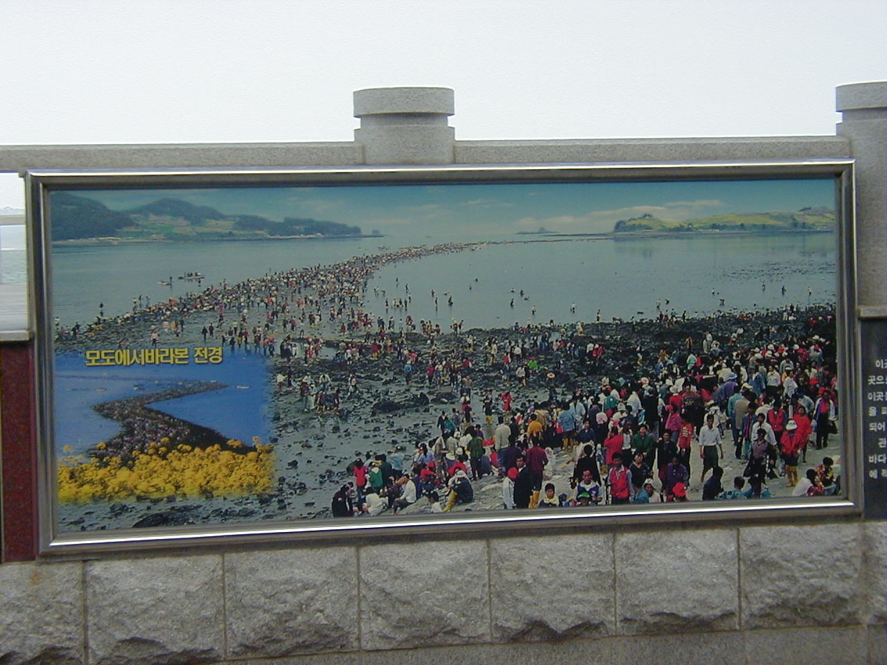 また、アジシは、海沿いに少し行けば案内板があり、そこに詳しい説明文が出ているからそれを見てくださいと言った。行ってみると、確かにそこには、海割れ現象時に、道の上を歩く大勢の人を映した大きな写真の標示板があった。【写真(海割れ現象時の写真標示板)】