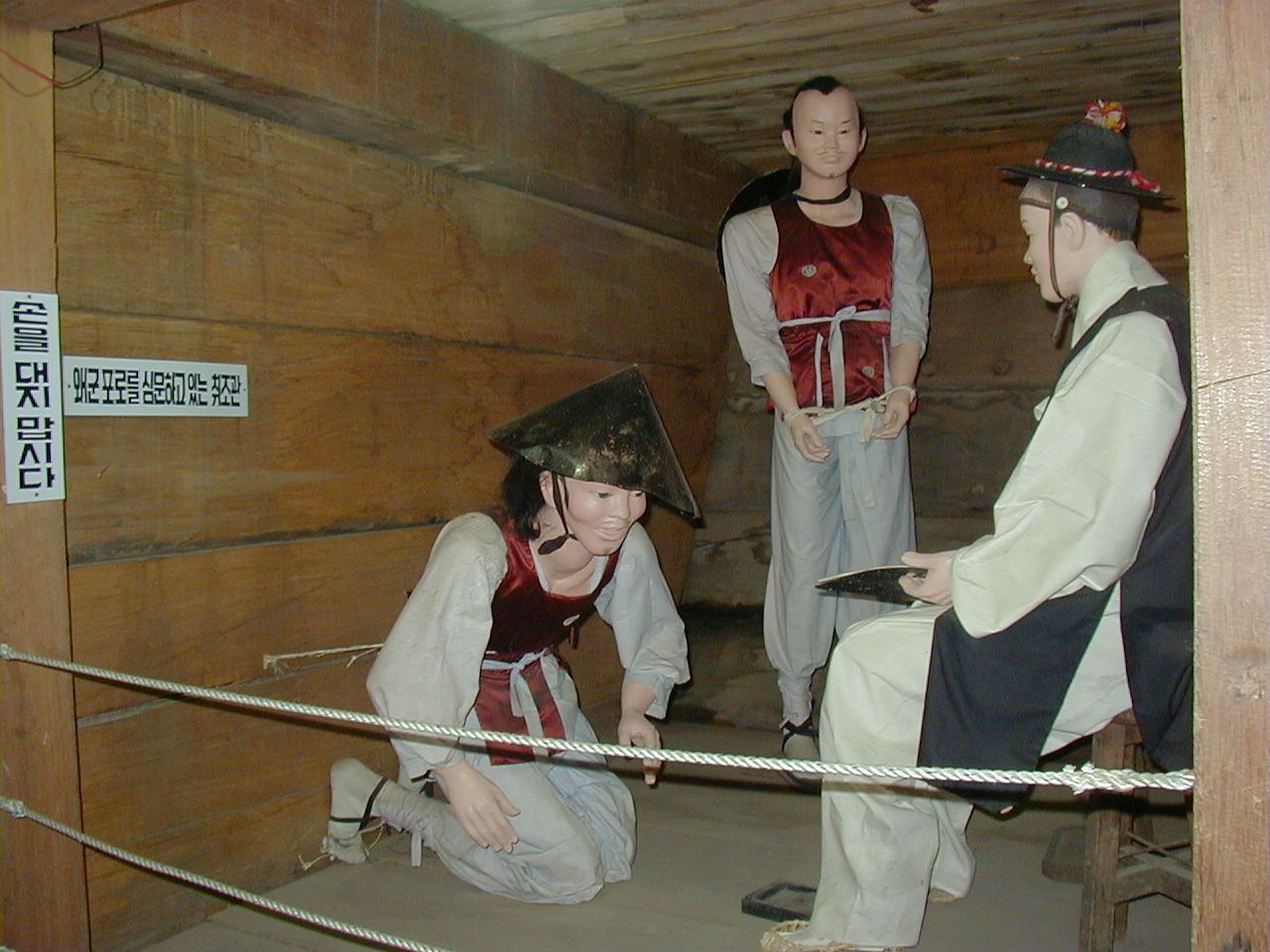 亀甲船は、豊臣秀吉の時代、文禄・慶長の役のとき、李舜臣将軍が閉麗水道で日本軍勢を迎え撃ったときに使った船のことである。亀甲船は、敵の攻撃から船を守るため亀の甲羅のような平べったい形をしており、その亀の甲羅の部分に鋭くとがった針を埋め込んでいる。文献を元に復元した実物大の模型船をここに浮かべているのである。